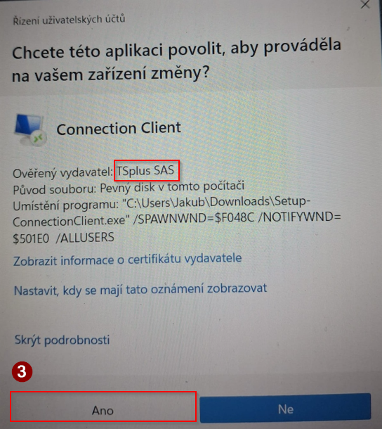 Zobrazí se modré bezpečnostní okno Windows (UAC). Zde uvidíte, že vydavatelem je TSplus SAS, což je naše partnerská technologie. Je to zcela v pořádku. Potvrďte instalaci kliknutím na ANO (krok č.3).